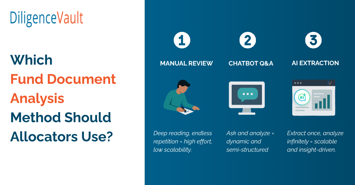 For decades, this was simply “the job.” But three approaches now compete for how we analyze fund documents: traditional manual review, conversational AI chatbots, and structured AI-powered extraction. Each has its moment. The question isn’t which is “best”, it’s which is optimal for your situation.