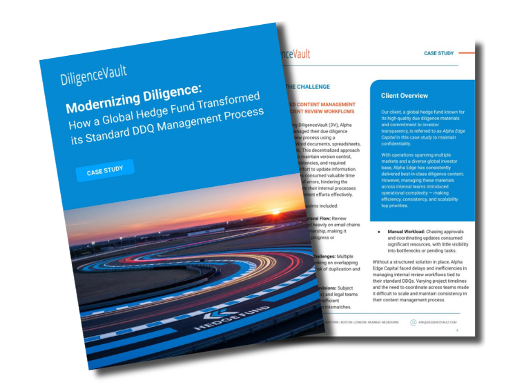 In the fast-paced world of hedge fund investor relations, efficiency and accuracy are critical. Our latest case study highlights how a global hedge fund, (pseudo named Alpha Edge Capital), faced the challenge of managing its standard DDQs using manual processes. Their fragmented workflows created inefficiencies and version control challenges. By implementing DiligenceVault, Alpha Edge Capital established a structured, centralized approach to streamline collaboration, improve content accuracy, and enhance scalability.