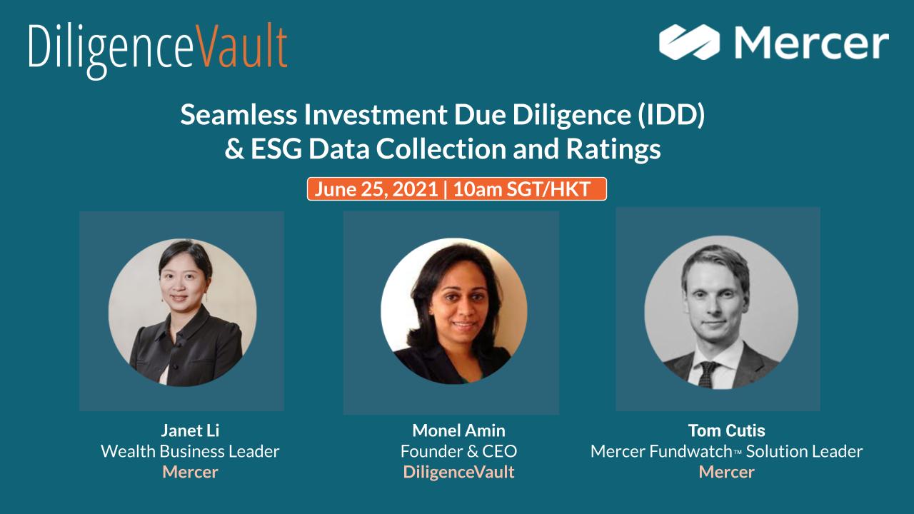In our recent webinar hosted by Mercer and DiligenceVault, our panel of experts, Janet Li, Wealth Business Leader at Mercer, Monel Amin, Founder and CEO at DiligenceVault and Tom Curtis, Mercer FundWatch™ Solution Leader at Mercer, discussed recent trends with focus on ESG and China, how to optimize due diligence and data collection workflows, and how Mercer and DV research integration provides value to users in Asia. You can access the webinar takeaways below.