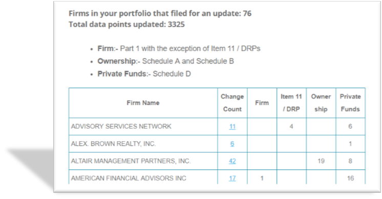 Configure daily / weekly email alert with Form ADV regulatory filing changes of your portfolio delivered to your inbox. Be proactive in identifying and monitoring risks in your portfolio. Track material changes in the Form ADV brochures easily on the platform.