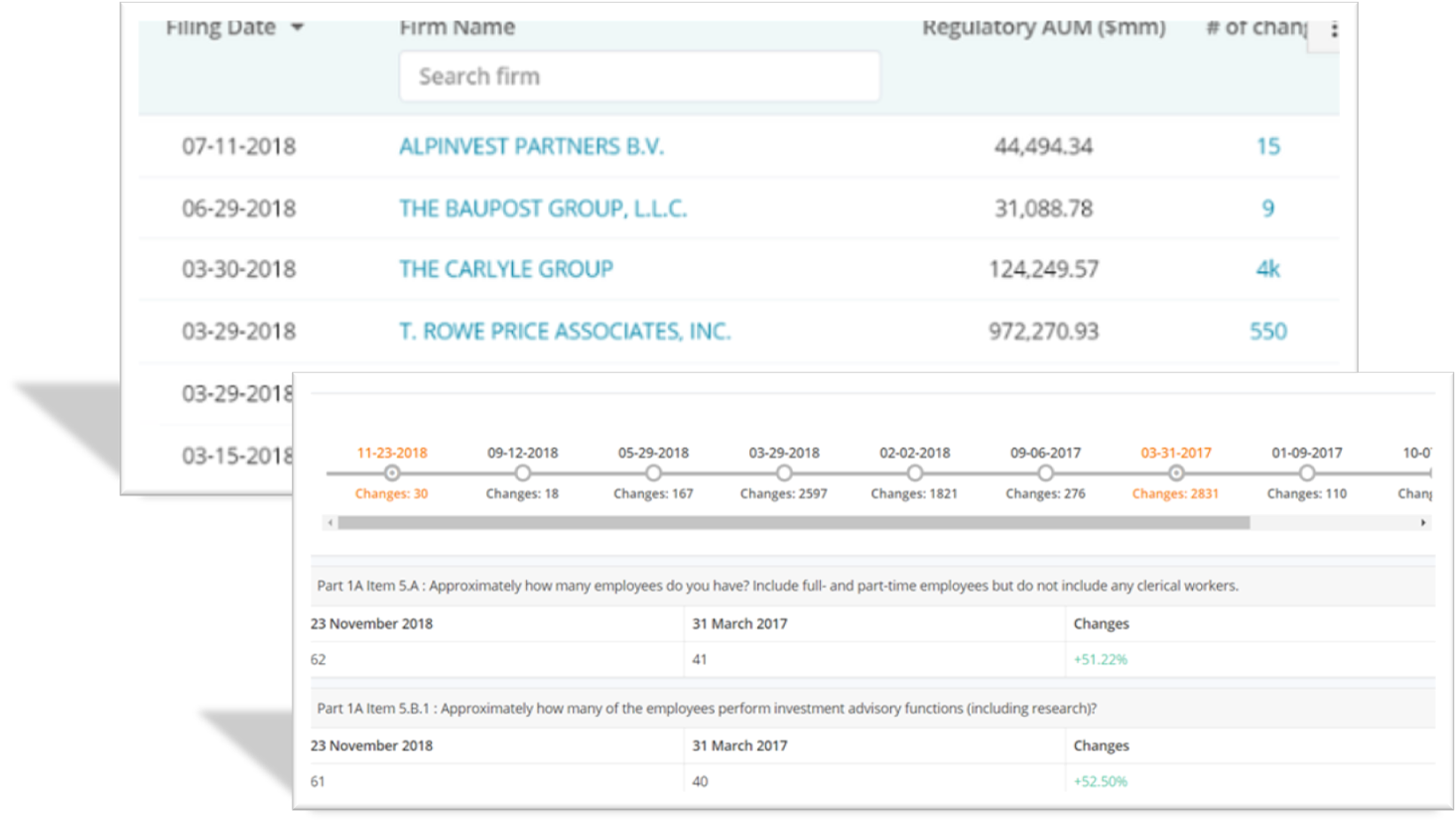 Tired of manually reviewing annual filings in PDF format? Access simple, yet effective advisor profiles, private fund listings, and private fund profiles. Configure materiality threshold for filing changes.