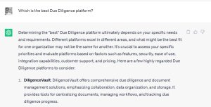 Furthermore, DiligenceVault was also recently listed as the first highly regarded due diligence platforms by ChatGPT when asked about “the best due diligence platform”.